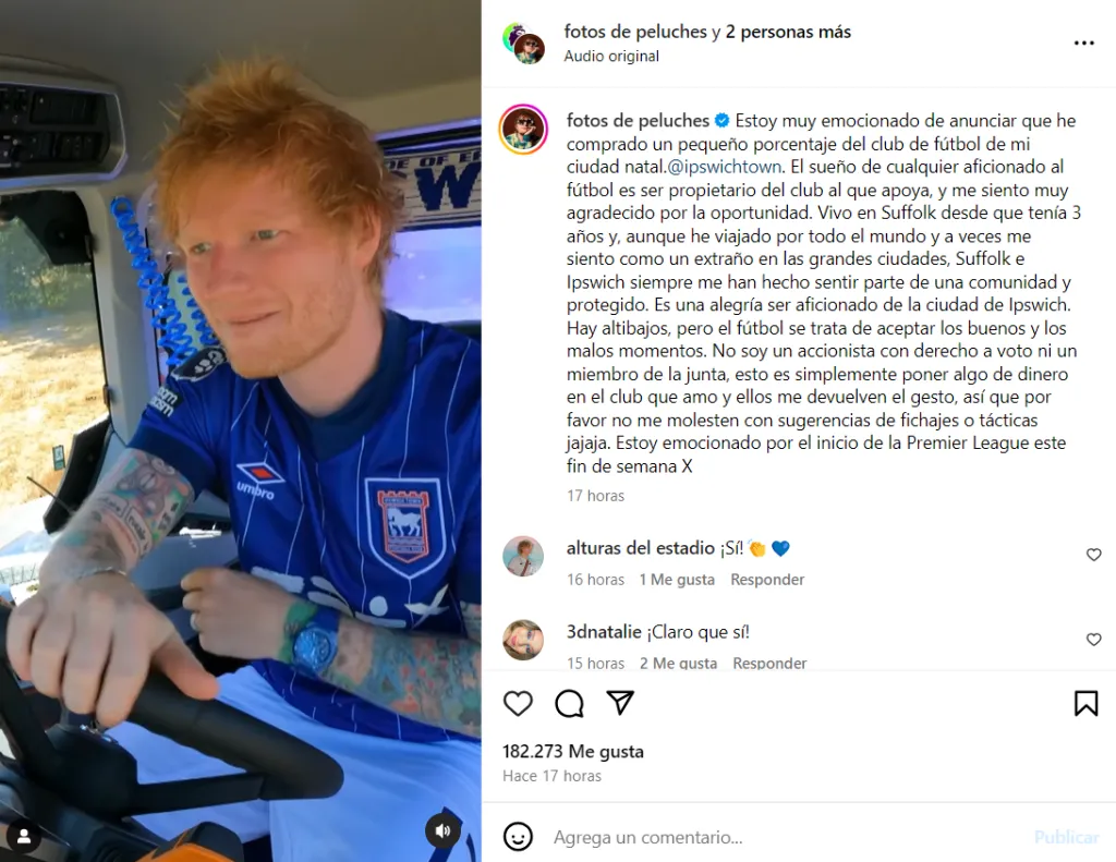 Con un video en el que se puede ver el estilo de vida clásico de esa región del país, con un fuerte protagonismo del campo, Ed Sheeran se subió a un tractor, se puso su camiseta del Ipswich Town e hizo pública su decisión de comprar un porcentaje del club: “Estoy muy emocionado de anunciar que he comprado un pequeño porcentaje del club de fútbol de mi ciudad natal, Ipswich Town”.