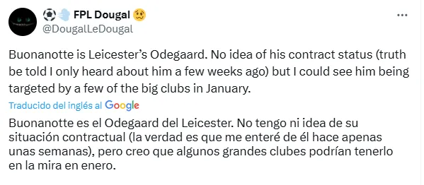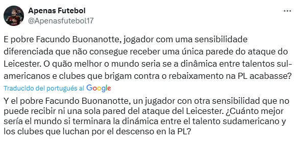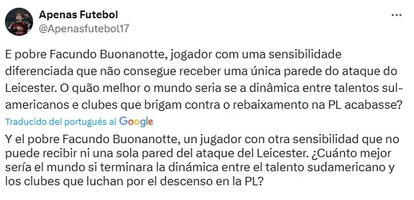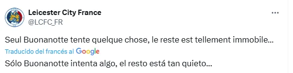 “Sólo Buonanotte intenta algo, el resto está tan quieto…”, “Buonanotte y Hermansen no tienen nada que reprocharse en este partido”, “Por favor, que alguien salve a Buonanotte en Leicester si descienden”, “Es el Odegaard del equipo”, “Buonanotte es muy bueno”, “Es un jugador con otra sensibilidad”, fueron algunos de los tantos comentarios de los hinchas de Los Foxes destacando al argentino.