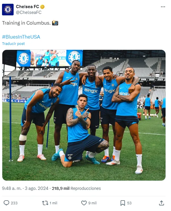 En la pretemporada que el equipo inglés está realizando en Estados Unidos, el entrenamiento terminó con una foto del ex-River junto con otros 5 compañeros: Malo Gusto (Francia), Levi Colwill (Inglaterra), Nico Jackson (Senegal), Tosin Adarabioyo (Inglaterra) y Reece James (Inglaterra).