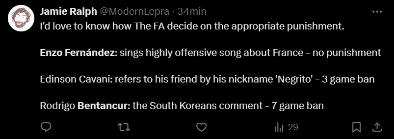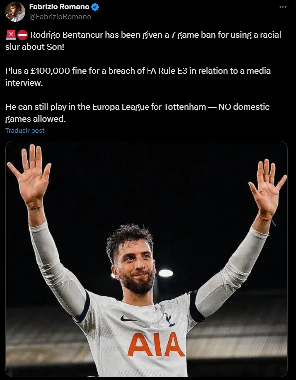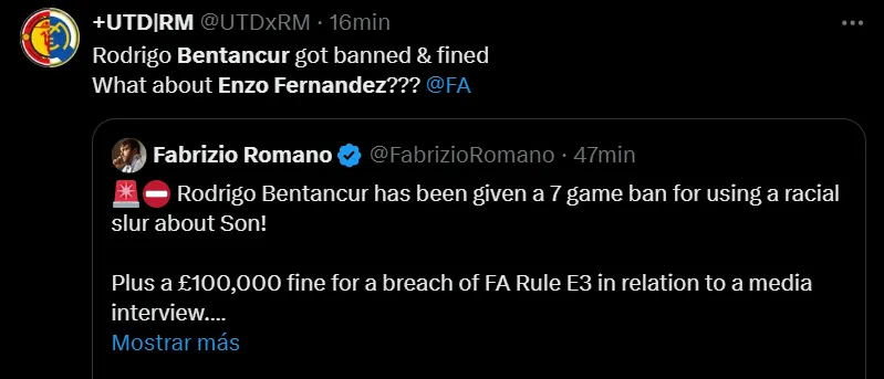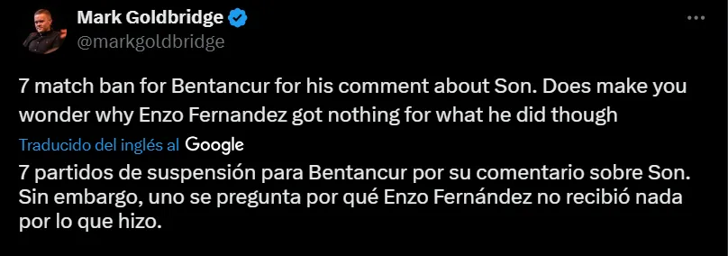 Incluso un reconocido influencer del mundo del fútbol como Mark Goldbridge, quien es uno de los fans del Manchester United con mayor presencia digital, se animó a meterse en la polémica y soltó un posteo que dio que hablar: “7 partidos de suspensión para Bentancur por su comentario sobre Son. Sin embargo, uno se pregunta por qué Enzo Fernández no recibió nada por lo que hizo“.