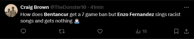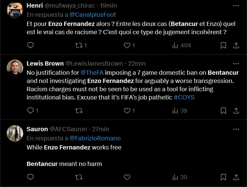 Con la confirmación de la suspensión a Bentancur, se desató la polémica entre periodistas e hinchas de Tottenham que en las redes sociales expresaron su bronca contra la Premier League porque le dieron una sanción ejemplar a su volante, pero en su momento no lo hicieron con Enzo Fernández, cuando se desató el escándalo de las acusaciones por racismo en las celebraciones de la Copa América 2024.
