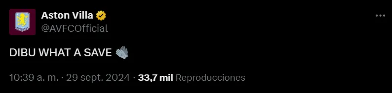 La atajada se volvió viral en redes sociales y en la cuenta de Aston Villa no dudaron en elogiar a su arquero. “Dibu, qué atajada“, expresaron en mayúsculas al momento del enorme movimiento del argentino campeón del mundo. Su similitud con la de Kolo Muani generó múltiples comparativas entre los usuarios de X y de otros redes.