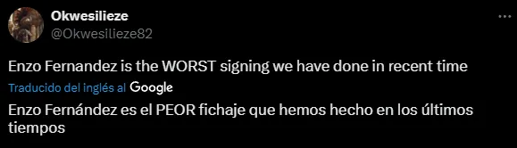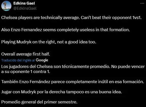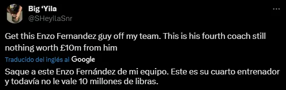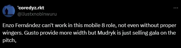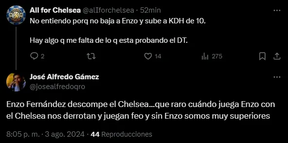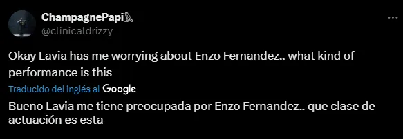 Ahora bien, las críticas más constructivas llegaron de otros hinchas que no sólo cuestionaron su posición de campo, sino que hasta destacaron a otro futbolista tras la salida del argentino en el partido ante Manchester City. “Romeo Lavia es mejor que Enzo Fernández” y “qué gran actuación de Lavia”, advirtieron.