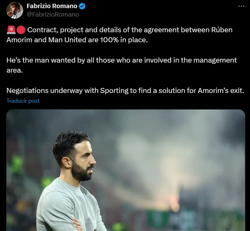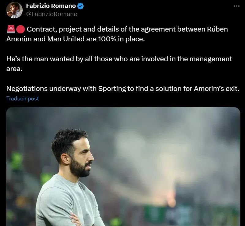 En sus redes sociales, Fabrizio Romano ya reveló que “el contrato, proyecto y detalles del acuerdo entre Rúben Amorim y el Manchester United están 100% listos“, y que solo restan pulirse los pormenores de su salida de Sporting, por la que los Red Devils deberán pagar una abultada indemnización que se sumará a los 18 millones de euros que ya tuvieron que pagar por el despido de Ten Hag.
