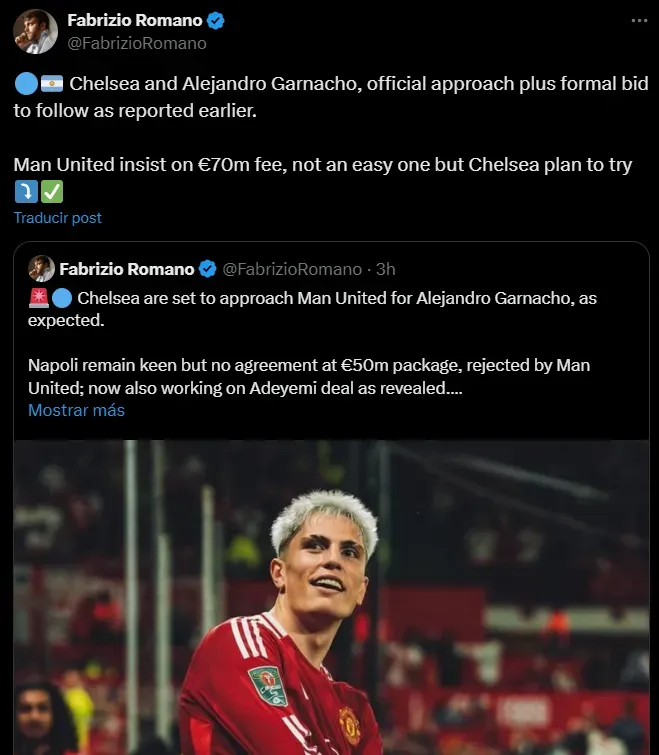 El periodista Fabrizio Romano reveló que Chelsea tiene un plan para quedarse con Garnacho en este mercado de pases, ya que los de de Londres se acercaron a los 70 millones que pretende Manchester y esperan que se acepten las condiciones para avanzar con la ficha contractual del argentino.