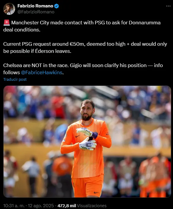 Cabe destacar que, para que todo esto suceda, aún debe resolverse un traspaso más: el de Ederson Moraes a Galatasaray. El club turco ultima detalles para llevarse al arquero brasileño del City, y una vez que se concrete se dará el avance ciudadano por Donnarumma, quien podría ser vendido por el PSG en 50 millones de euros.