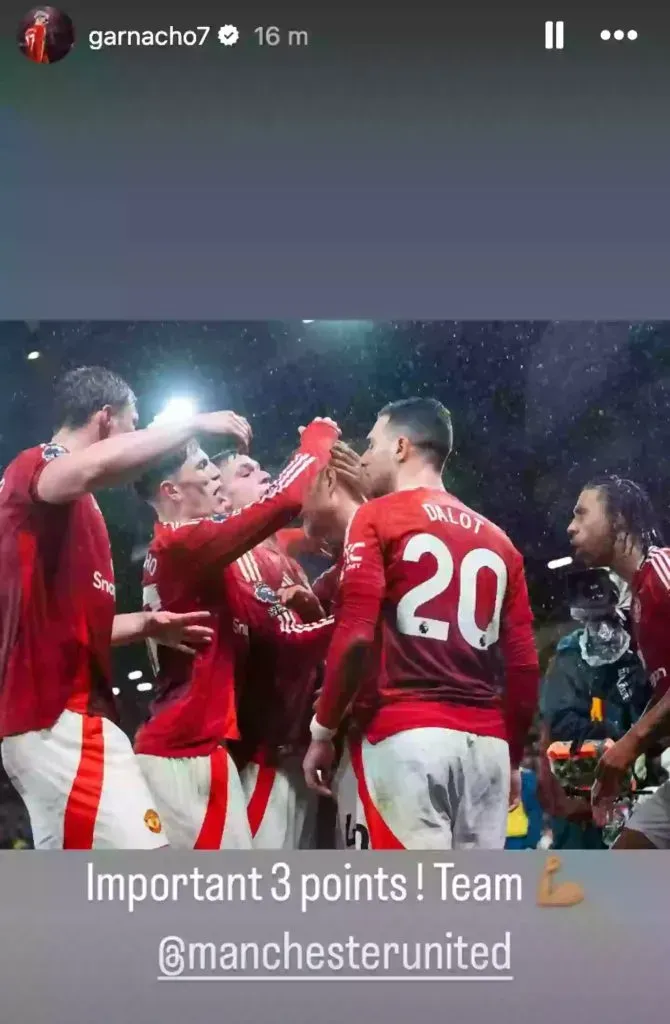 Una vez consumada la victoria, con el gol de Harry Maguire en el segundo tiempo, Alejandro Garnacho tomó su cuenta de Instagram para dejar su reacción de lo que fue el partido. Fue una historia concisa, con cuatro palabras y una foto del festejo de uno de los goles.