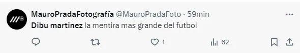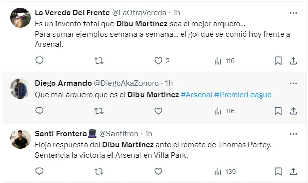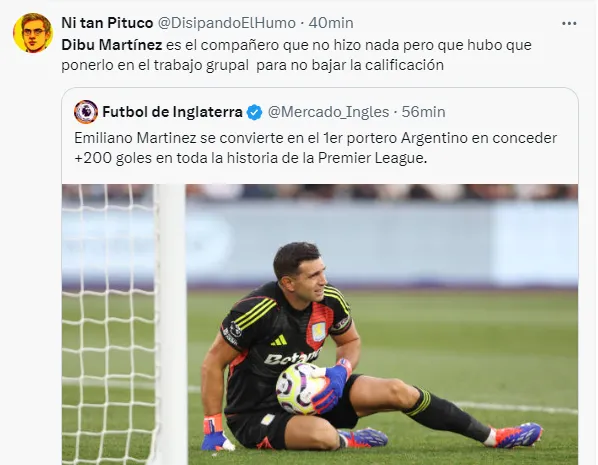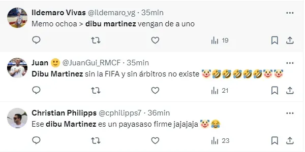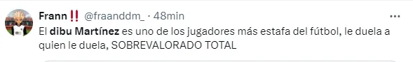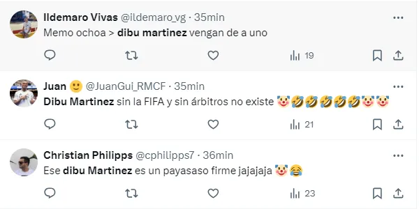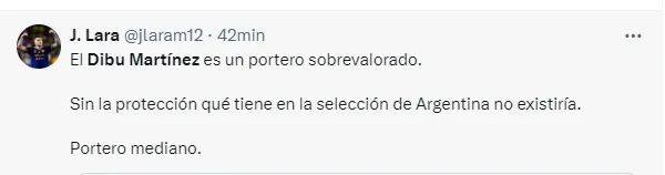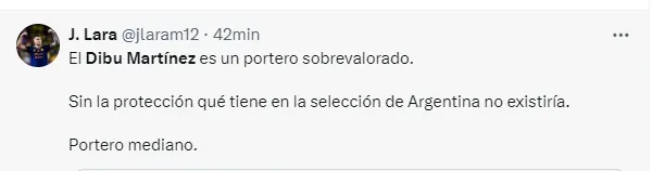 “El Dibu Martínez es uno de los jugadores más estafa del fútbol, le duela a quien le duela, sobrevalorado total”, “Dibu Martinez sin la FIFA y sin árbitros no existe”, “Ese Dibu Martinez es un payasazo firme”, “El Dibu Martínez es un portero sobrevalorado”, “El Dibu Martínez la mentira más grande del fútbol”, fueron algunos de los comentarios de los usuarios criticando al arquero argentino.