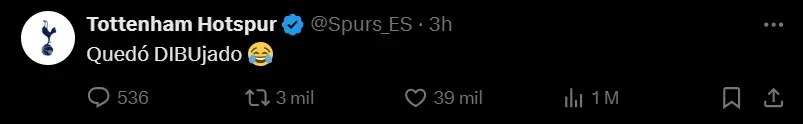 Al finalizar el encuentro, desde las redes sociales de Tottenham se burlaron de Aston Villa por la goleada tomando al Dibu como punto para las chicanas. Cuando Maddison convirtió el cuarto gol, de tiro libre, el marplatense no llegó siquiera a tirarse para intentar tapar el remate, siendo un espectador de lujo del golazo del inglés. Allí, en la cuenta de X de los Spurs expresaron: “Quedó DIBUjado“, junto a un emoji de risas.