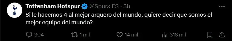 Para seguir tomando de punto a Dibu Martínez, la cuenta del club londinense soltó otro posteo dedicado para él. “Si le hacemos 4 al mejor arquero del mundo, quiere decir que somos el mejor equipo del mundo?”, señalaron. Ambos tuits se volvieron virales al instante.