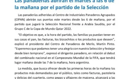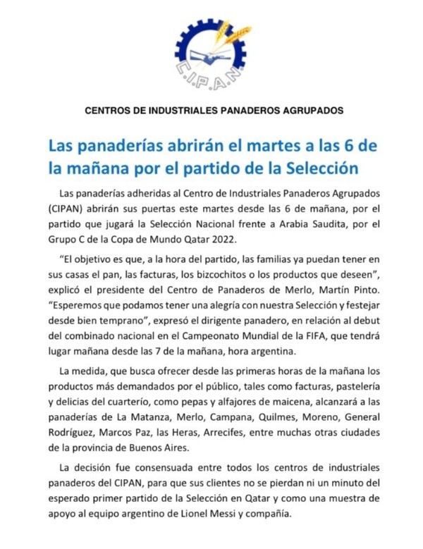 Después de tanta incertidumbre, en las últimas horas apareció un comunicado oficial por parte deCentros de Industriales Panaderos Agrupados, en donde quedó confirmado que todas las panaderías del país abrirán sus puertas a las 6 de la mañana, una hora antes de que inicie el choque en Medio Oriente.“El objetivo es que, a la hora del partido, las familias ya puedan tener en sus casas el pan, las facturas, los bizcochitos o los productos que deseen”, reza Martín Pinto, el presidente del Cento de Panaderos de Merlo, en el membrete oficial. ¡Y toda la República Argentina lo festejó como un gol!