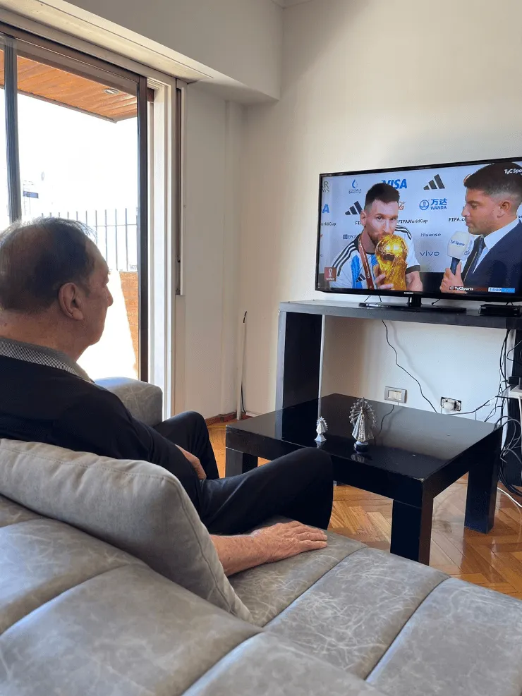 En plenos festejos, consagración y locura, se hizo viral una foto de Bilardo en las redes sociales en donde se lo vio al Doctor observando en su domicilio el partido y más precisamente, el post triunfo y coronación en donde habló con Gastón Edul en el campo de juego del Estadio Lusail. La imagen fue publicada e instantanemente se viralizó. ¡Enorme, Doc; tu alegría es la de todo un país!