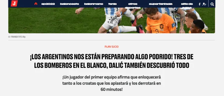 “¡Los argentinos nos están preparando algo podrido! Tres de los bomberos (jugadores) en el blanco. Dalic también descubrió todo”, titula el informeque dice que”Un jugador argentino, según nos contaron, admitió ante sus compañeros de su club europeo que se les encomendó la tarea de provocar y dar instrucciones sobre cómo sacar de ritmo a los croatas. (…) Expresó su creencia de que volverá locos a los croatas. que los romperán y los derrotarán en 60 minutos. El vestuario de ese club ha estado zumbando al respecto desde entonces”.