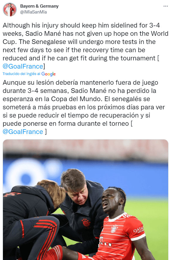 El panorama más optimista apunta a una rehabilitación desde tres a cuatro semanas de duración, cuando comience la etapa eliminatoria del Mundial. Senegal sabe que deberá afrontar la fase de grupos sin su mega-estrella y referente, una misión complicada en una zona con el anfitrión Qatar, Ecuador y Países Bajos.