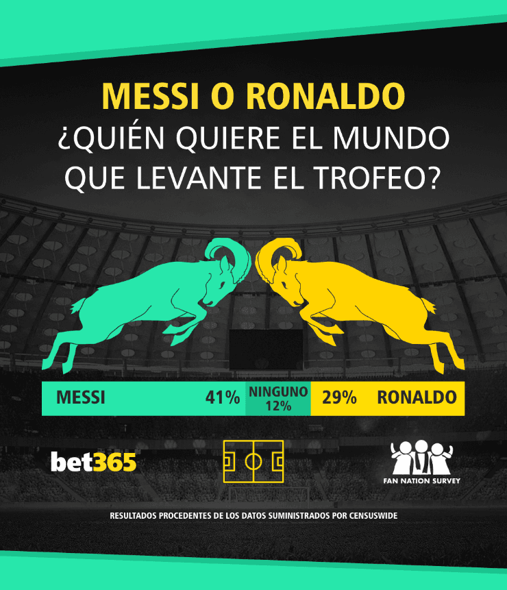 A nivel mundial, en Bet365, los hinchas optaron por ver aMessi levantar el trofeo de la Copa del Mundo a su rival de toda la vida, Cristiano Ronaldo, con una proporción de 4 a 3.