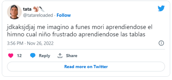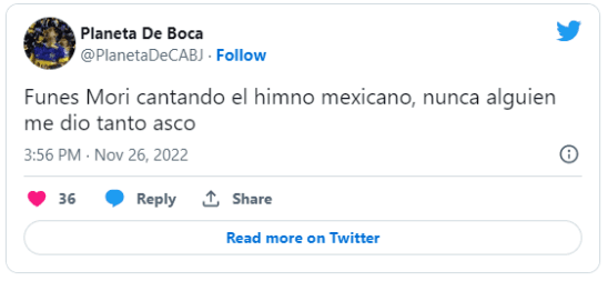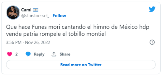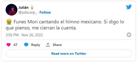 “Funes Mori cantando el himno de México es la peor traición que vivimos desde Chile en la guerra de Malvinas”, soltó un usuario de Twitter. “¿Que hace Funes Mori cantando el himno?”, se preguntó otro. No gustó.