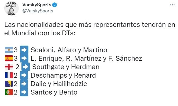 En lo que refieren a las 32 selecciones clasificadas, uno de los tantos números previos que se barajan antes de cada edición esla cantidad de técnicos y las nacionalidades de los mismos que dirán presente. Cabe resaltar que tantoEspañacomoArgentina, a menos que exista un cambio de última hora,son los mayores representantes en esta categoría con 3 cada uno.