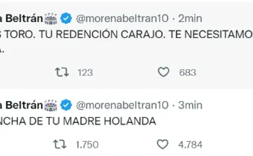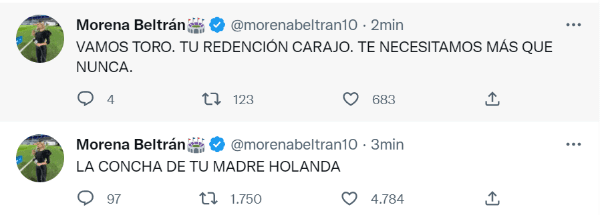 En su cuenta de Twitter, Beltrán disparó con vehemencia en sus comentarios contraAntonio Miguel Mateu Lahoz por el flojo arbitraje que tuvo en todo el encuentro, y destacó al goleador de Inter de Milán: “Vamos Toro. Tu redención carajo. Te necesitamos más que nunca”, escribió en la red social del pajarito.
