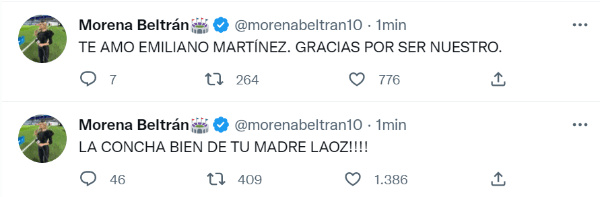 Luego de la fenomenal actuación de Emiliano Martínez en los disparos desde los doce pasos, la reconocida periodista de ESPN, Morena Beltrán, apareció en las redes sociales para desquitarse con el árbitro, el rival de turno y también para halagar al arquero argentino y al autor del gol de la clasificación, Lautaro Martínez.