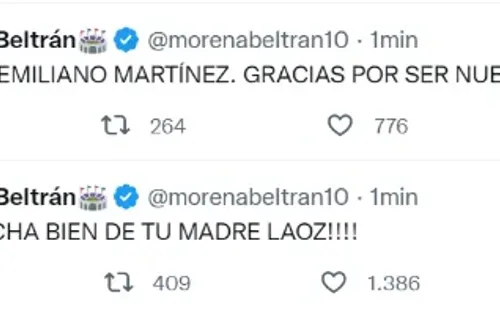 Así como cargó contra el arbitraje del español y celebró la actuación del ex Racing, le agradeció a Dibu Martínez por ser argentino e insultó a Países Bajos, a quien mencionó como Holanda.De analizar el fútbol a mostrarse como una hincha más. Y en las redes sociales, sus fanáticos se volvieron locos al punto de generar que su nombre fuera tendencia.