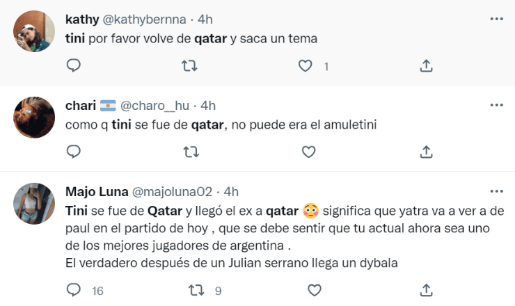 Resulta que Tini tuvo que viajar el lunes 5 de diciembre hacia la ciudad española de Barcelona por sus cuestiones laborales, donde comenzaría a rodar un nuevo videoclip, y los hinchas cuestionaron su partida, ya que creían que a la Selección Argentina, pero sobre todo a De Paul, se le terminaría la “magia”. Nada de eso ocurrió. El combinado accedió a la semifinal del Mundial de Qatar, y allí fue que se generó la redención.