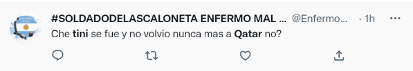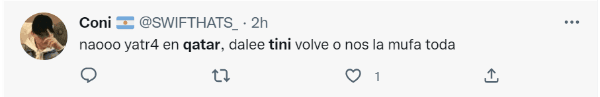 A través de Twitter, los fanáticos argentinos celebraron la clasificación al penúltimo encuentro de la cita mundialista, a pesar de que lamentaron la ausencia de la cantante pop, y ahora se conoció su verdadero paradero: Tini Stoessel está en Argentina, disfrutando de un merecido descanso después de tanto trabajo. Incluso, en las últimas horas se la pudo observar en una foto dentro de un supermercado, realizando las compras diarias.