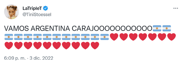 Más allá de lo futbolístico, que generó una enorme alegría en el pueblo argentino, en las redes sociales se produjo muchísima repercusión por la presencia de Tini Stoessel en las tribunas. La cantante pop, que también es pareja de Rodrigo De Paul, volvió a alentar a la Selección Argentina y lo hizo junto a su familia.