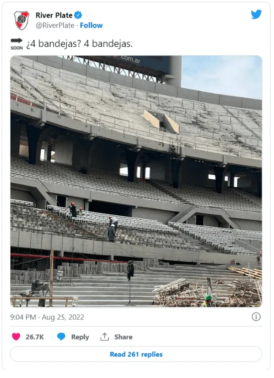 Tal es así que, ayer por la noche, uno de los posteos que realizó la cuenta oficial del club en Twitter se volvió viral en segundos. Resulta que el Millonario compartió una imagen mostrando cómo va quedando la Sívori Baja, sector que dejará de ser platea para transformarse en popular.