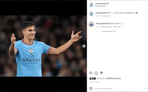 “Great night of Champions (gran noche de Champions)”, escribió la Araña en su cuenta de Instagram. Su compañero le contestó:”Bravo Julián”. El comentario despertó miles de likes y los hinchas de River -que desde que Álvarez puso la firma son recontra citizens- lo celebraron.