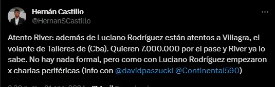 El nacido en Morteros, Córdoba, y surgido en el semillero de Rosario Central ya estuvo en el radar de River en anteriores ocasiones. Ahora, ante la necesidad de cubrir la posición, desde el Millonario no descartan nuevamente ir a la carga por él, por lo que ya lo sondearon; y la respuesta de Talleres fue más que contundente.