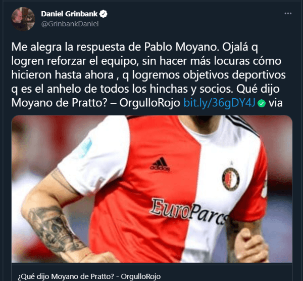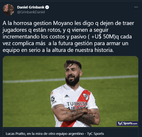 Inmediatamente, Daniel Grinbank, empresario muchas veces vinculado a Independiente, se despachó con una acusación muy fuerte, indicando que el Rojo de Avellaneda se había interesado en un jugador “roto”, haciendo referencia a Pratto. Esto generó la reacción de Pablo Moyano, vicepresidente del propio elenco de Julio Falcioni.