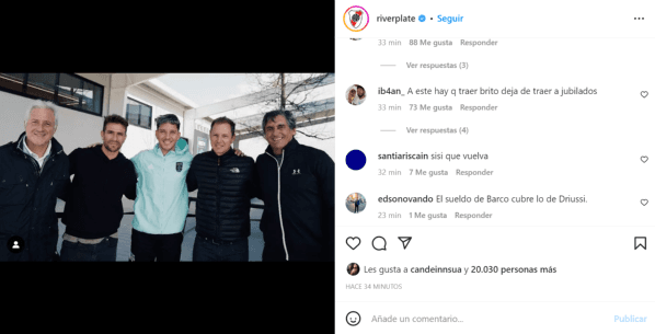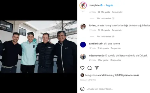 Tras lo que fue el triunfo de los dirigidos por Demichelis, desde la cuenta oficial que tienen los de Núñez en la red social Instagram publicaron una imagen en la que se visualiza a Driussi junto al presidente Jorge Brito, el vicepresidente Matías Patanian, el Enzo Francescoli (Director Deportivo) y Leonardo Ponzio (Secretario Técnico). Y allí fue que los hinchas solicitaron por el retorno del goleador.