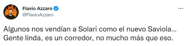 A través de su cuenta de Twitter, el reconocido ysiempre polémico periodista Flavio Azzaro arremetió contra el Pibe, de quien sostuvo que “algunos nos vendían a Solari como el nuevo Saviola… Gente linda, es un corredor, no mucho más que eso”. A partir de la crítica que realizó el ex panelista de TyC Sports, los hinchas del Millonario lo acribillaron en los comentarios.