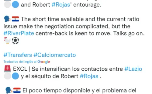 Según informóRudy Galetti, periodista deSportitalia, la Lazio está en negociaciones avanzadas para contratar a Robert Rojas antes de se cierre la ventana de traspasos el próximo 31 de enero. “El poco tiempo disponible y el problema en las proporciones complican la negociación, pero el central de River Plate tiene muchas ganas de moverse a Europa. Las conversaciones continúan”, señaló el cronista italiano.