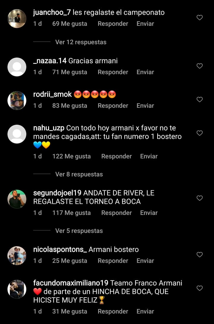 Sin embargo, el “Pulpo” lo tapó y terminó dándole el último empujón a Boca para la consagración a menos de cinco kilómetros de donde River y Racing se vieron las caras. Por haber significado esto dicha salvada, fueron varios hinchas millonarios que le coparon el Instagram a Armani y repudiaron su accionar, mientras que otros salieron a bancarlo.