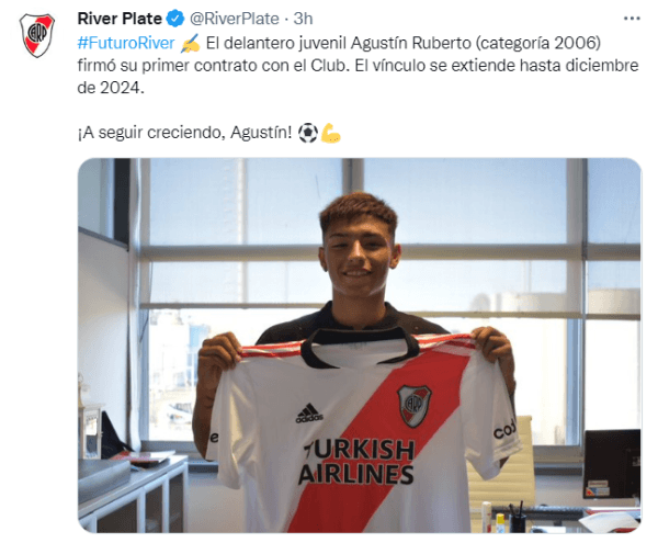 En línea con el plan institucional de la Comisión Directiva, este miércoles se hizo oficial otra firma de contrato a pocas horas del partido contra Alianza Lima por la CONMEBOL Libertadores. Se trata deAgustín Ruberto, delantero de apenas 16 años (categoría 2006), quien obtuvo su primer vínculo profesional con el Millonario aún sin debutar en Primera. ¿La próxima joya?