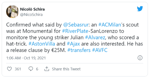 El periodista Nicoló Schira, especialista en mercados de pases, confirmó el seguimiento del club italiano y agregó que hay interés desde otros dos equipos importantes: el Ajax de Nicolás Tagliafico y el Aston Villa de Dibu Martínez y Emi Buendía.