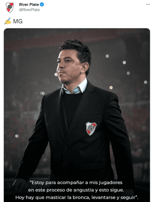 “Estoy para acompañar a mis jugadores en este proceso de angustia y esto sigue. Hoy hay que masticar bronca, levantarse y seguir”, dice la foto que subió La Banda a Twitter acerca de las palabras del Muñeco. A partir de hoy, el Millo buscará pelear todos los frentes que le quedan hasta que inicie el Mundial de Qatar y el consuelo del entrenador hacia sus dirigidos será clave para levantar el ánimo tras la eliminación copera.