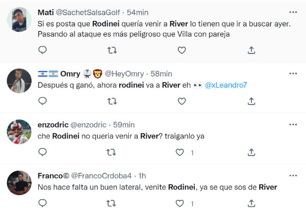 Hace varias semanas, Rodinei afirmó su deseo de llegar al club de Núñez, ya que se le termina el contrato a fin de año y no renovará con los de Rio de Janeiro. Por eso mismo, en las redes sociales desde la parcialidad riverplatense hicieron su labor, e hicieron tendencia al lateral brasileño pidiéndole que se sume al plantel.