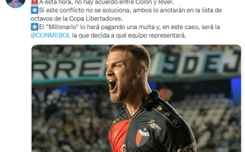 Según informó César Luis Merlo, hasta la fecha no hay acuerdo entre las instituciones y, a pesar de la fuerza que pueda estar haciendo el jugador desde su lugar, Colón lo anotará en la lista de buena fe de la CONMEBOL Libertadores para que juegue el partido de ida de los octavos de final contra Talleres de Córdoba, el próximo 29 de junio. De esta manera, si suma al menos un minuto en cancha no podrá participar con River en toda la edición del certamen continental.