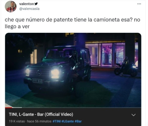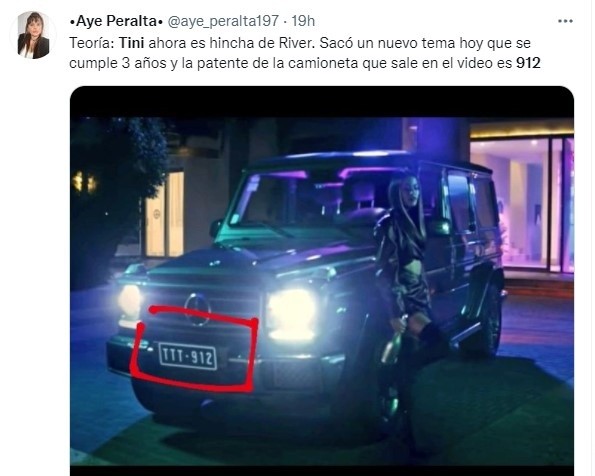 Es que, en la primera escena del video, Tini aparece junto a una camioneta que se encuentra estacionada frente a un bar. Pero los ojos inevitablemente se van hacia la patente del vehículo: TTT 912.