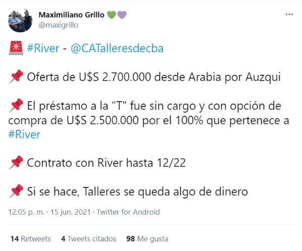 La ‘T’ no estaría dispuesta a poner ese dinero, pero desde Arabia incluso superaron dicha oferta y en Núñez lo ven con muy buenos ojos pensando en hacer caja para poder tentar algún nombre de peso. Además la institución cordobesa también se quedaría con una pequeña parte por la transacción.