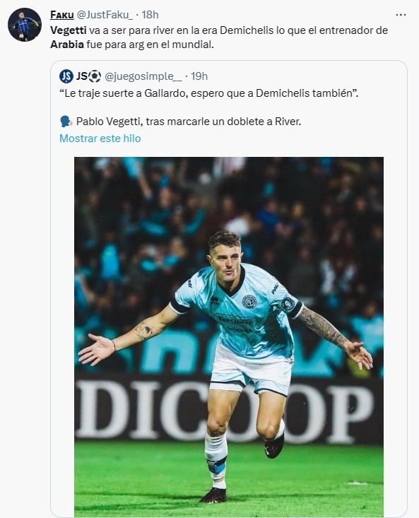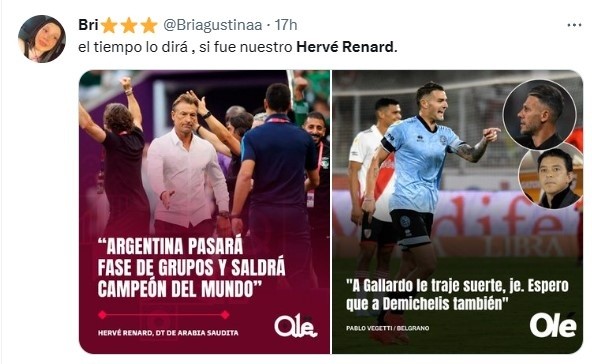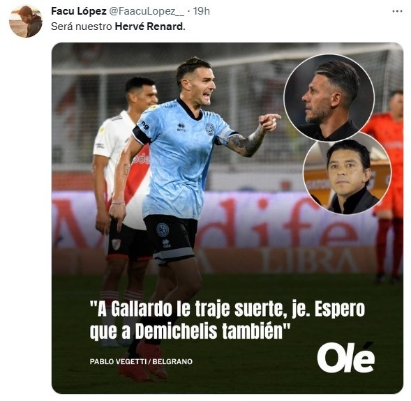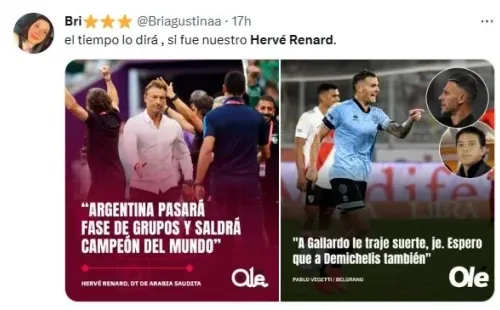 Los hinchas del Millo se tomaron bien las palabras de Vegetti y hasta trazaron la comparación con lo que había comentadoHervé Renard, DT de Arabia Saudita, tras vencer a Argentina en el debut de Qatar 2022. “Van a pasar la fase de grupos y van a salir campeones”, había dicho el entrenador francés. ¿Se repite la premonición del atacante de Belgrano?