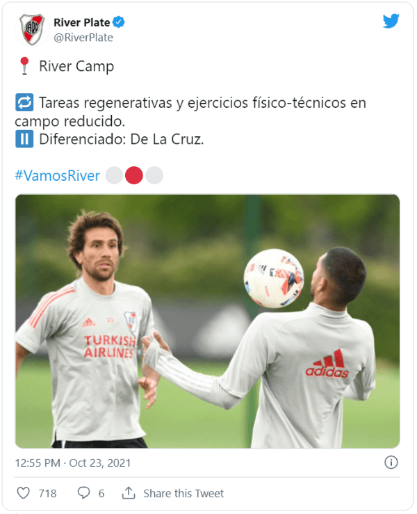 El club de Núñez informó que solo Nicolás De La Cruz entrenó diferenciado y eso es porque tanto Paulo Díaz como Fabrizio Angileri recibieron el alta médica. Se presume que ambos regresarían al once titular, aunque el Muñeco lo definirá recién en la práctica del domingo.