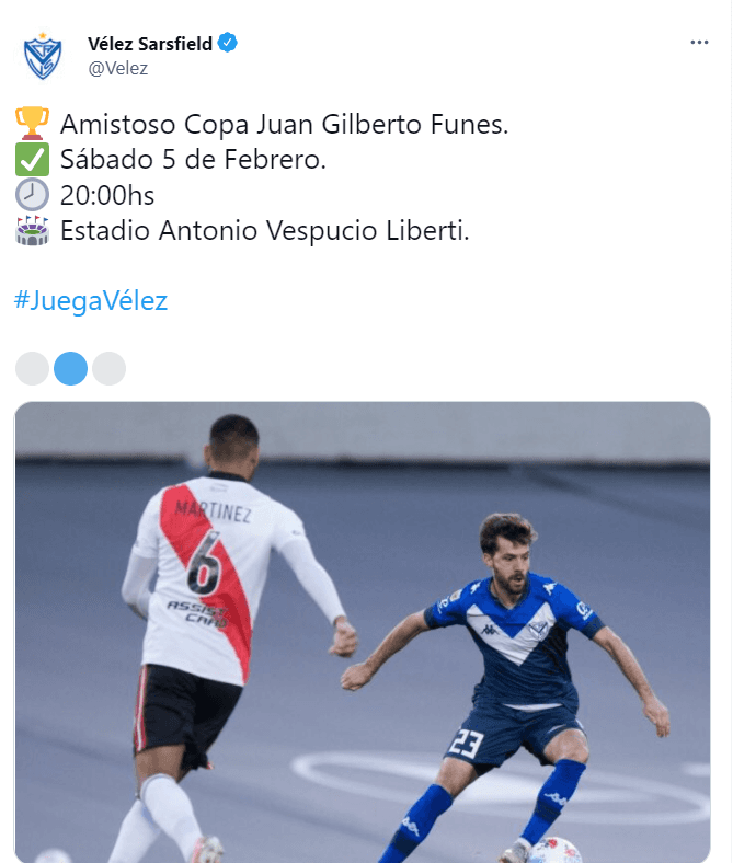Según informaron las redes oficiales de Vélez, el Millonario y el Fortín disputarán un partido por la CopaJuan Gilberto Funes el sábado 5 de febrero a las 20 horas en elEstadio Antonio Vespucio Liberti. Ahora, los simpatizantes de ambos clubes aguardan por la venta de entradas.
