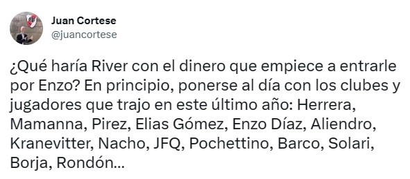 Riverdejó de moverse en el mercado de pases pero aún así fue protagonista durante el cierre del período de transferencias en Europa gracias a la multimillonaria venta de Enzo Fernándezal Chelsea, la cual se cerró por una cifra aproximada a los 120 millones de euros. Antes de irse de Núñez, la dirigencia pactó la retención del 25% de una futura operación y la cláusula hoy da frutos sin precedentes para el fútbol argentino.