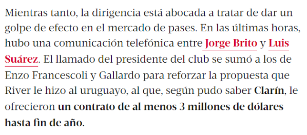 Según informó el diarioClarín, el Millonario le habría ofrecido a Luis Suárez un contrato que ronda los 3 millones de dólares hasta diciembre de 2022, cifras que están más cerca de parecerse a la élite de Europa que al fútbol argentino. Es la inversión que planea el club para contar con una de las estrellas más importantes del deporte rey en la última década.