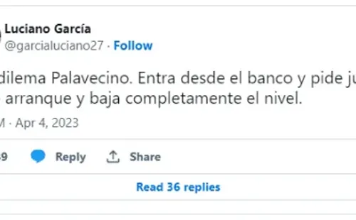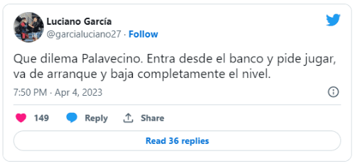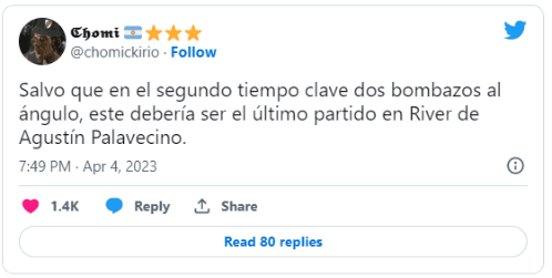 “Entra desde el banco y pide jugar, va de arranque y baja completamente el nivel”, escribió un hincha en sus redes. “No es capaz de dársela a un compañero”, cuestionó un usuario. Otro fue más terminante: “Este debería ser su último partido en River”. Duro.