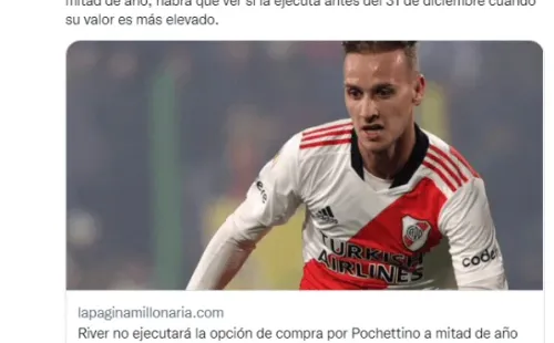 Teniendo en cuenta la modalidad que escogió River para moverse en el anterior libro de pases, utilizando frecuentemente la vía del préstamo con varias cláusulas de por medio, en Núñez se encontraron con la posibilidad de adquirir el pase de Tomás Pochettino hasta el 30 de junio por un monto aproximado de 5 millones de dólares. No obstante, La Banda desistió de la opción de compra y mantendrá la cesión hasta fin de año, según informóLa Página Millonaria.