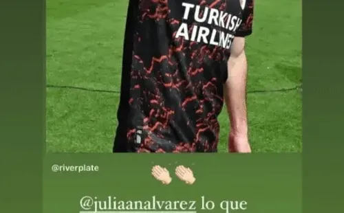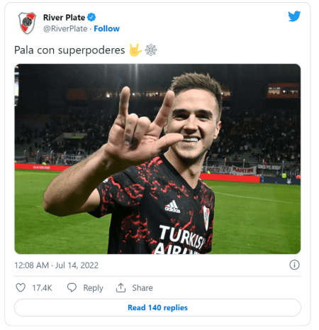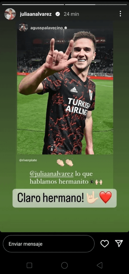 Apenas finalizó el encuentro, el CM de River puso “Pala con superpoderes” y una foto del volante haciendo el gesto del Hombre Araña, en una clara dedicatoria para Julián Álvarez. El ex-Platense es amigo del delantero y, a la distancia, le mandó un lindo mensaje.